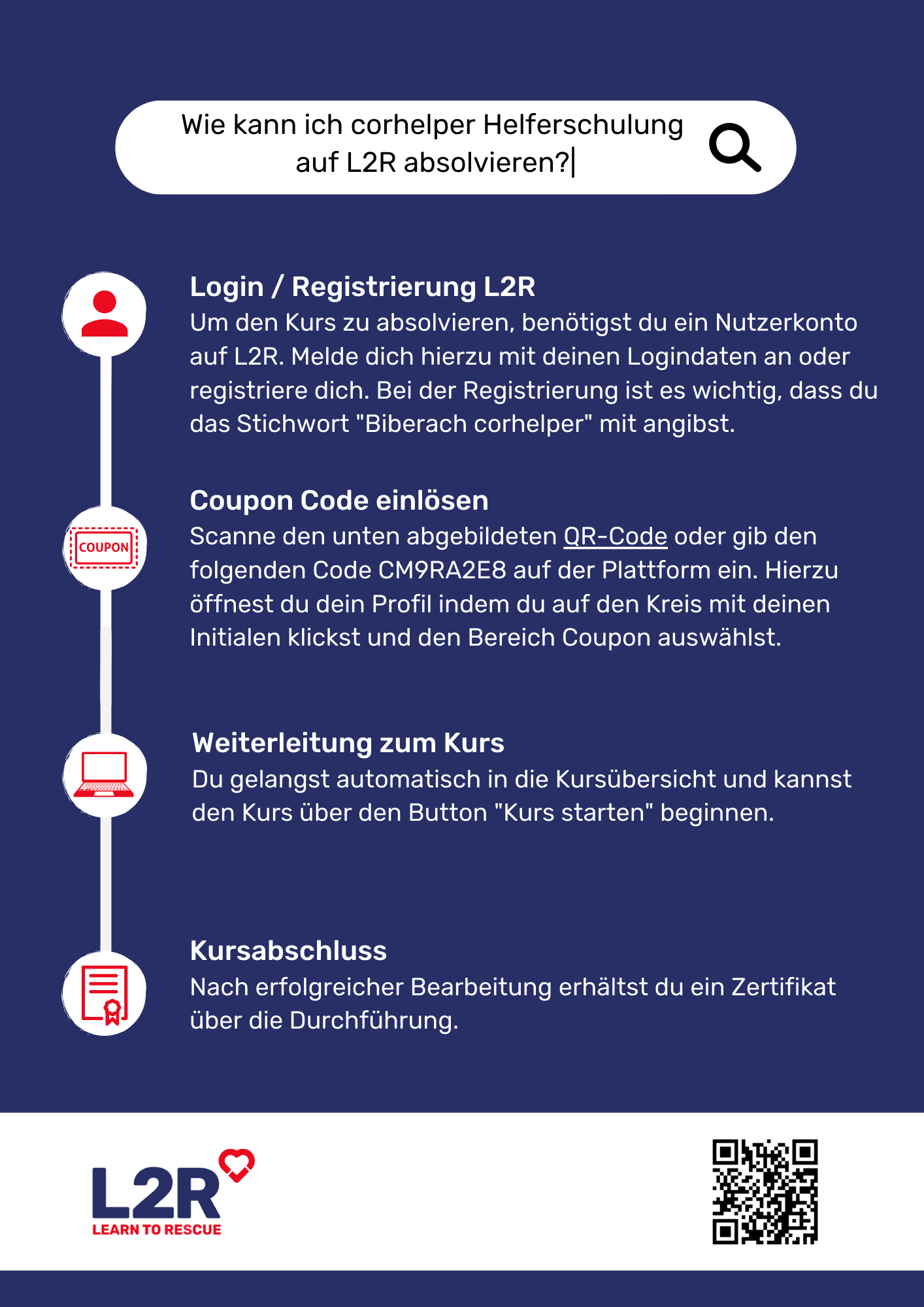 Als Mindestqualifikation für die „corhelper”-Schulung muss ein absolvierter Erste-Hilfe-Kurs vorliegen, der nicht länger als zwei Jahre zurückliegt. Nach erfolgreich absolvierter Schulung steht das Notfalltraining „corhelper" an.