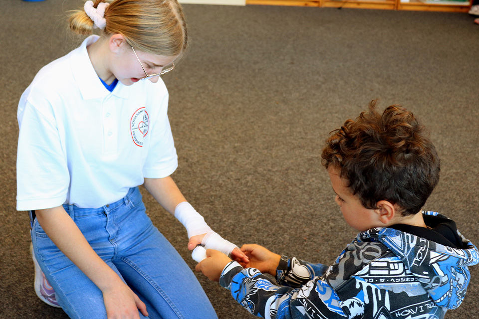 Neben dem DRK und dem Jugendrotkreuz Bad Buchau beteiligten sich auch die Freiwillige Feuerwehr Bad Buchau und die Polizei am Aktionstag. Von der stabilen Seitenlage über den richtigen Notruf bis hin zur Verbandskunde reichte das Programm – ergänzt durch eine ganz neue Station: die Psychologische Erste Hilfe. Hier lernten die Kinder von den Schulsanitätern, wie sie auf ein verängstigtes oder verletztes Kind zugehen und es trösten können. Franziska Rist, angestellt beim Haus Nazareth und Schulsozialarbeiterin der Federseeschule, hat diesen Programmpunkt entwickelt und angeleitet.