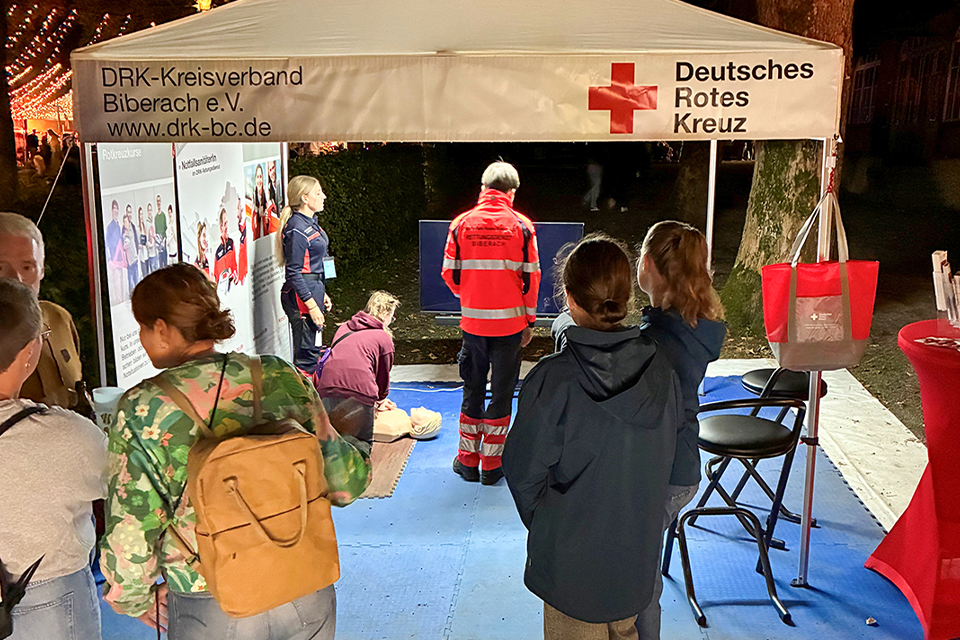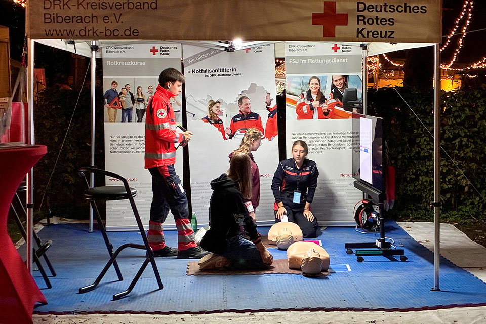 Der Workshopstand mit Ausbildungssimulationsanhänger des DRK-Kreisverbands Biberach e. V. hat beim FreeFlow Festival auf dem Gigelberg in Biberach für reges Interesse gesorgt. Unterstützt von Praxisanleitern und engagierten Notfallsanitäter-Auszubildenden konnten die Besucherinnen und Besucher am Freitag und Samstag selbst aktiv werden.