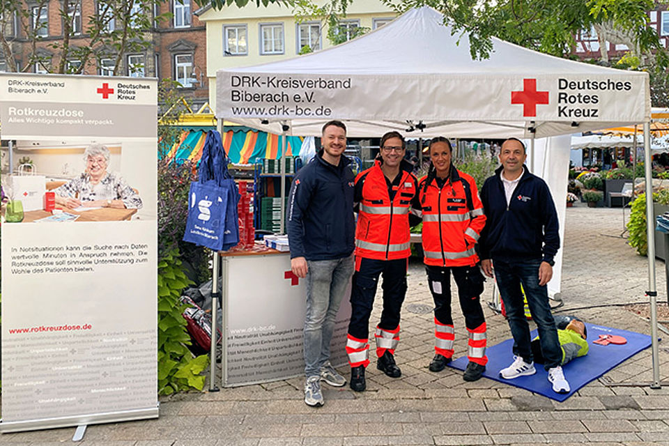 Wenn das Herz plötzlich stehen bleibt, ist jede Minute wertvoll. Doch was tun in solch einem Notfall? Genau zu dieser Frage haben der DRK-Kreisverband Biberach und das Sana Klinikum Biberach in der „Woche der Wiederbelebung“ auf dem Wochenmarkt in Biberach informiert. Ihr gemeinsames Ziel: Die Bevölkerung für den plötzlichen Herztod sensibilisieren, die Kenntnisse in Erster Hilfe auffrischen und Ängste nehmen.