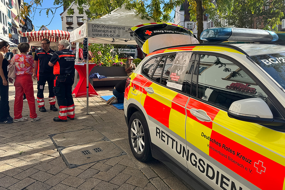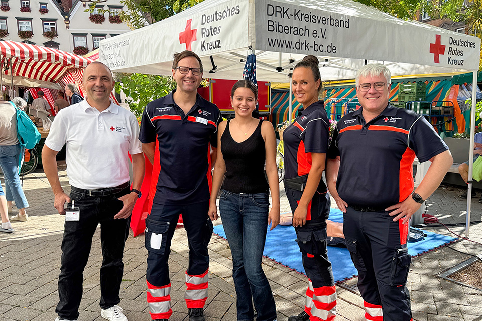 Bei einer gemeinsamen Aktion des DRK-Kreisverbands Biberach e. V. und des Sana Klinikums Biberach konnten Besucherinnen und Besucher auf dem Biberacher Wochenmarkt lebensrettende Sofortmaßnahmen kennenlernen. Denn wenn das Herz plötzlich stillsteht, zählt jede Minute – und doch wissen viele nicht genau, was im Ernstfall zu tun ist. Anlass hierfür war die bundesweite „Woche der Wiederbelebung 2025“.